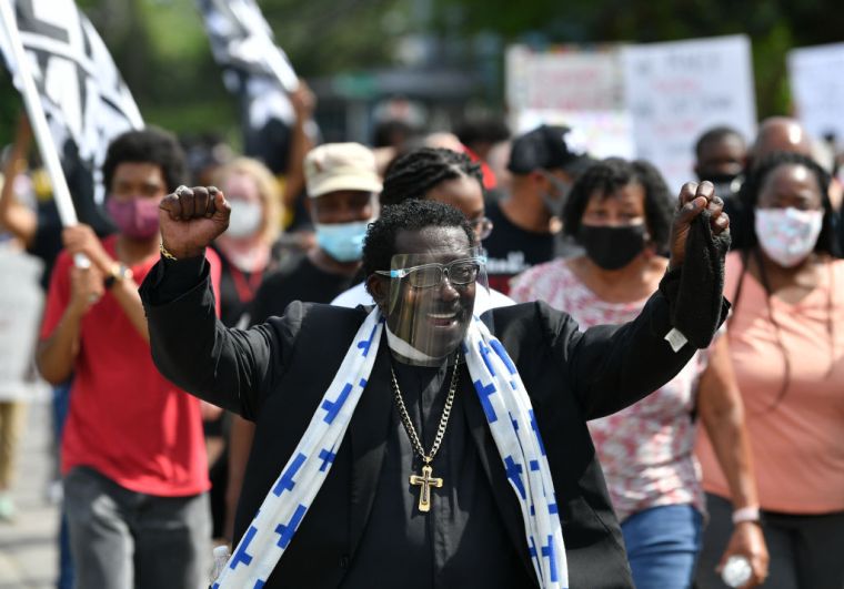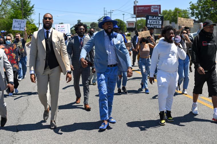 Reverend Greg Drumwright (left) leads a march during a protest after the killing of Andrew Brown Jr. demanding the release of the body camera videos the day before the funeral in Elizabeth City on May 2.