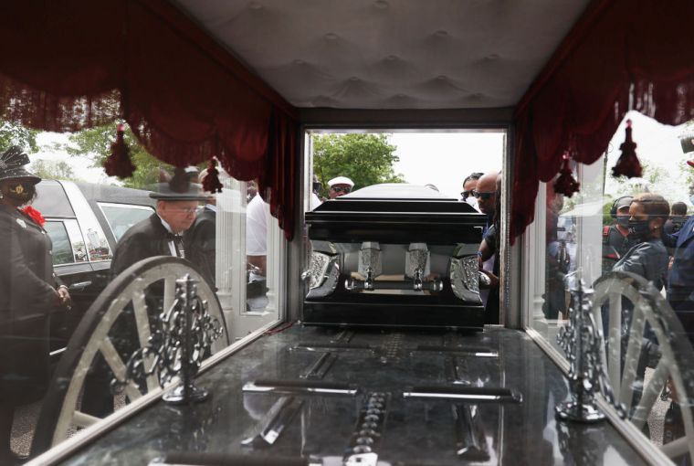 Pallbearers place the casket of Andrew Brown Jr. into a horse-drawn carriage before his funeral.